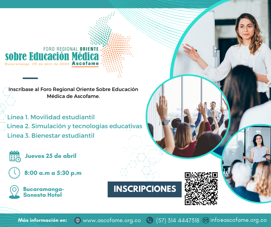 Incríbase al Foro Regional Oriente sobre Educación Médica de Ascofame que se realizará el próximo Jueves 25 de abril en la ciudad de Bucaramanga. Aplican descuentos especiales para estudiantes, personal administrativo facultades y egresados de las Facultades de Medicina que hacen parte de Ascofame. La inscripción incluye refrigerio, almuerzo, constancia de participación y acceso a las memorias del evento. |