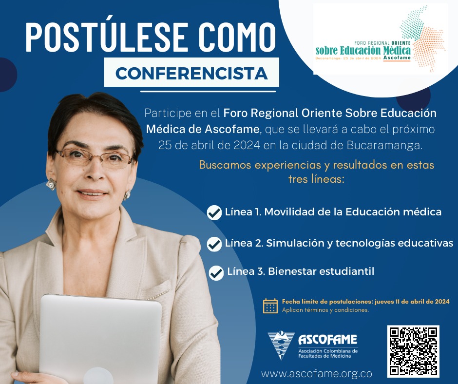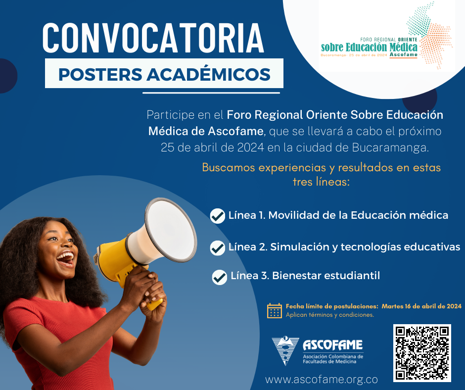 Convocatoria presentación de pósters académicos. Socialice su investigación en el Foro Regional Oriente Sobre Educación Médica de Ascofame, que se llevará a cabo el próximo 25 de abril de 2024 en la ciudad de Bucaramanga. |
