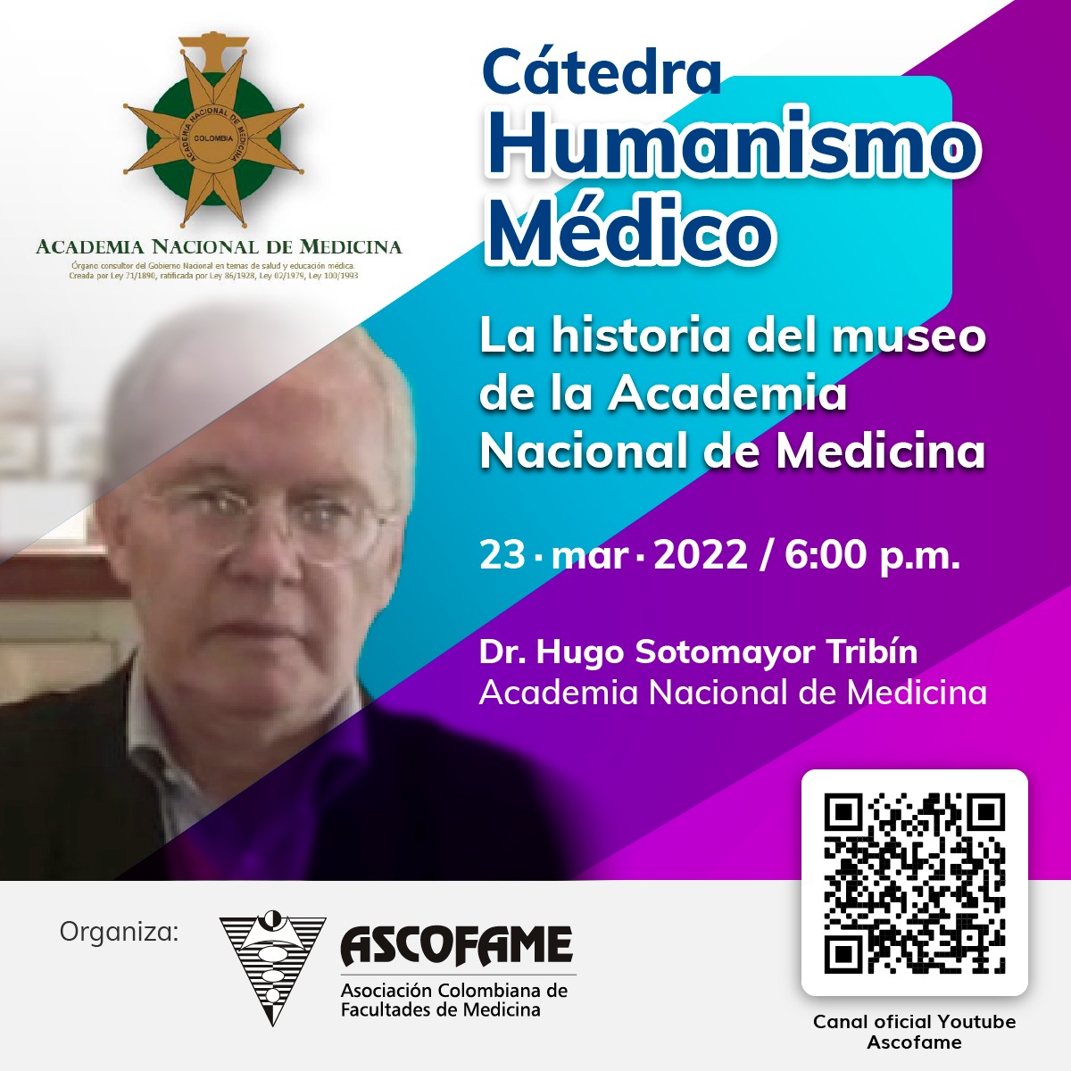 Los invitamos a conectarse hoy miércoles 23 de marzo a partir de las 6 p.m a la Cátedra sobre Humanismo Médico ofrecida por la Academia Nacional de Medicina, con el apoyo de Ascofame. En esta oportunidad nos acompañará el Doctor Hugo Sotomayor Tribín con su cátedra: La historia del museo de la Academia Nacional de Medicina. |
