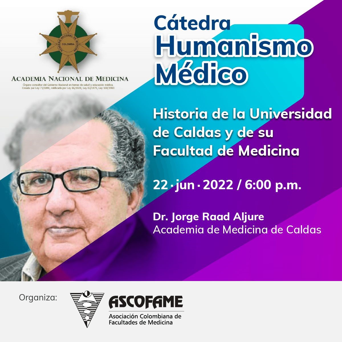 Los invitamos a conectarse hoy miércoles 22 de junio a partir de las 6 p.m a la Cátedra sobre Humanismo Médico ofrecida por la Academia Nacional de Medicina, con el apoyo de Ascofame. En esta oportunidad nos acompañará el Dr. Jorge Raad Aljure, con su cátedra: Historia de la Universidad de Caldas y de su facultad de medicina. |
