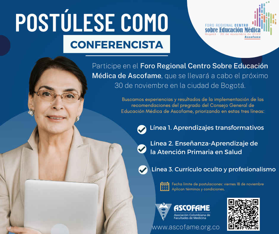 Facultades de Medicina Región Centro Ascofame, ya están abiertas las postulaciones para ser conferencista en el Foro Regional sobre Educación Médica de Ascofame que se realizará el próximo 30 de noviembre en la ciudad de Bogotá. Este evento cuenta con 12 espacios académicos disponibles. Buscamos a docentes, investigadores, estudiantes o administrativos de las 17 facultades de medicina que hacen parte de la región centro y que quieran compartir sus conocimientos, experiencia y resultados de la implementación de las recomendaciones del pregrado del Consejo General de Educación Médica de Ascofame. Toda la información la encuentran en https://bit.ly/3hzzq2h |